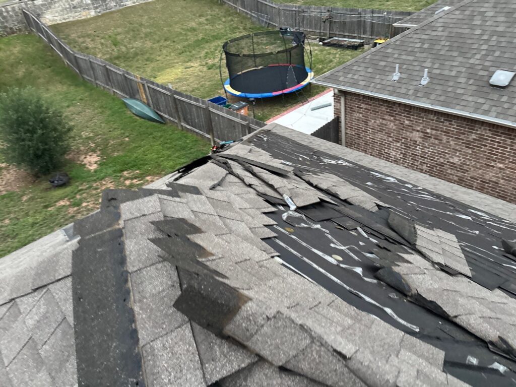 Wind-damaged shingles — lifted tabs that have broken their adhesive bond don’t always look visibly wrong from below. But get up on the roof and you can feel them shift underfoot, see the gap where the edge should be sealed. Those are shingles waiting for the next storm to make them a missing shingles situation. Storm damage caught at this stage is almost always an insurance-covered repair.